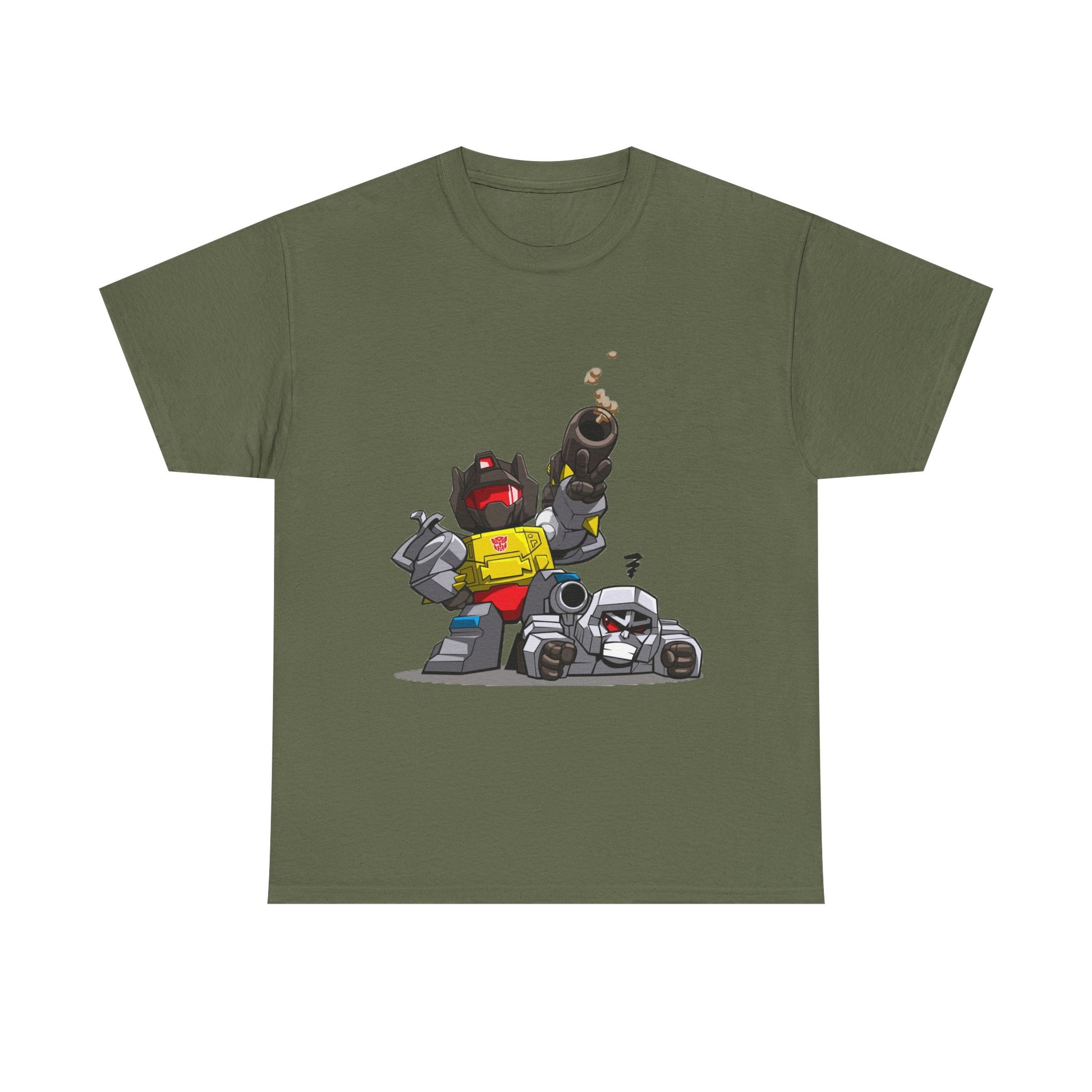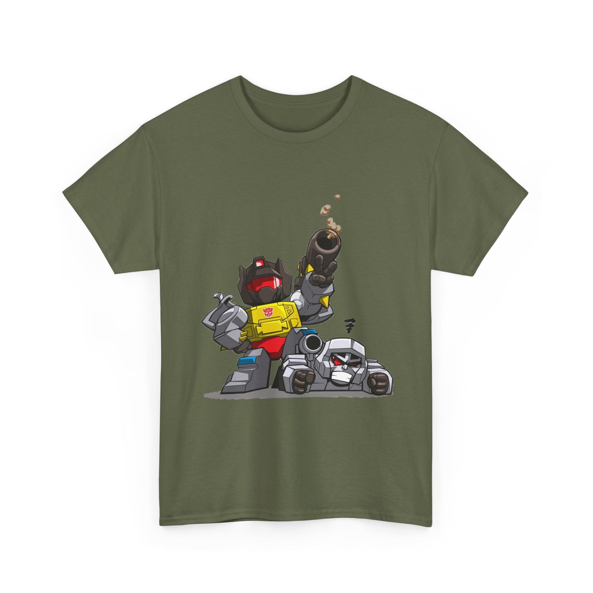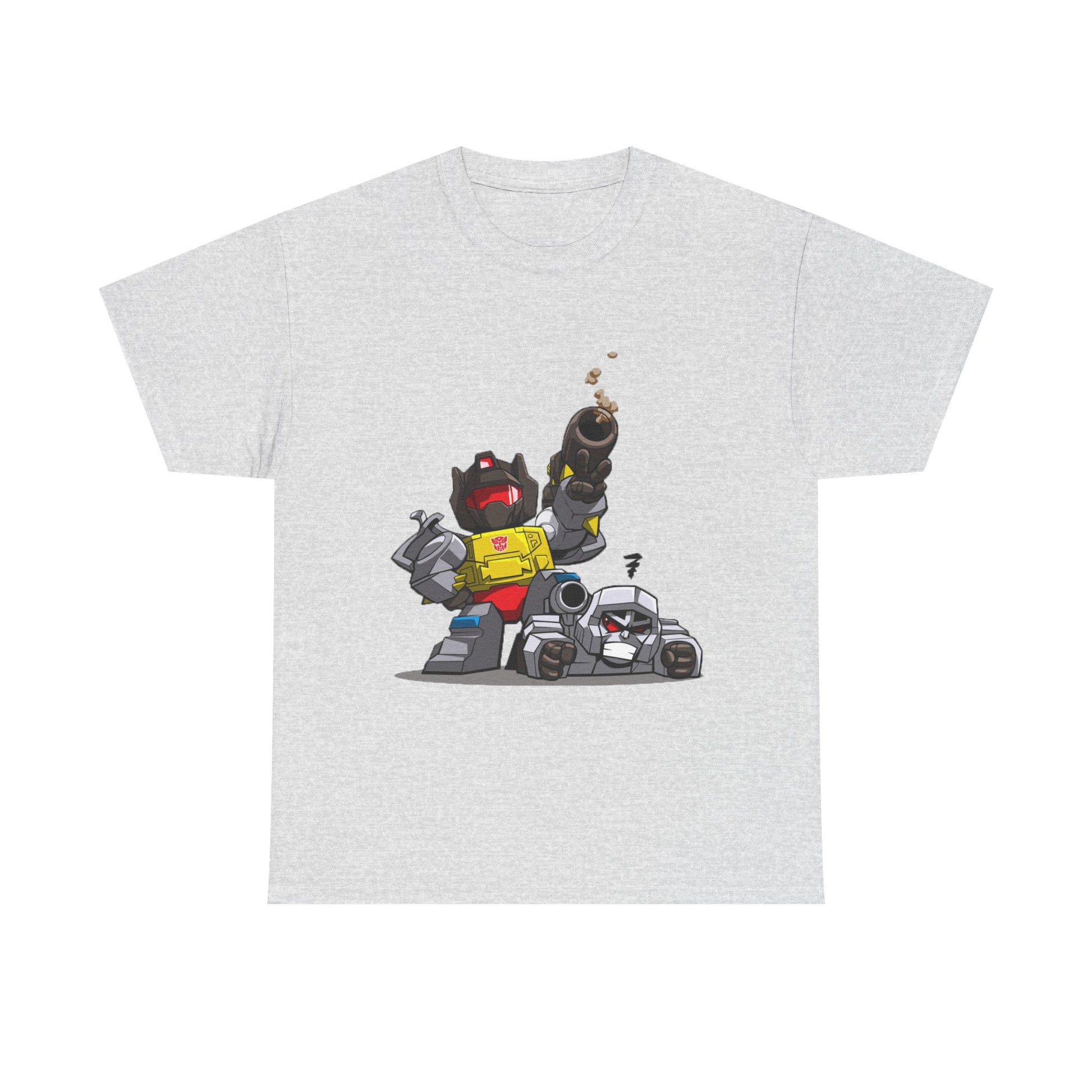 This Grimlock beats Megatron Funny Chibi Style tee exudes a playful and lighthearted vibe, perfect for fans of the Transformers franchise. Whether worn casually or as a statement piece, this tee is sure to bring a smile to the face of the wearer. Ideal for adults and relevant for fans of Transformers, this tee is perfect for casual wear, comic conventions, and themed parties.